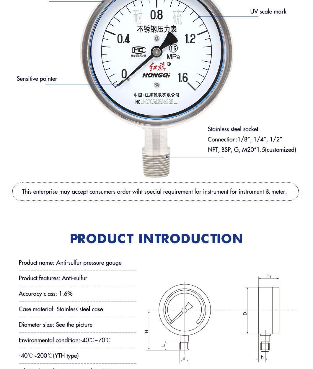 Manômetro de Aço Inoxidável Resistente a Ácido Hongqi Ytu-100